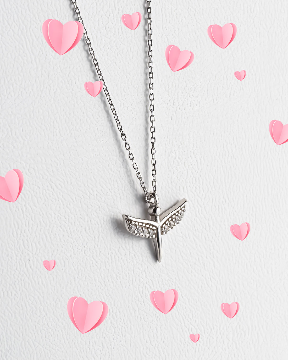 BABY ANGEL NECKLACE This petite angel charm necklace features a minimalist pendant design that symbolises...