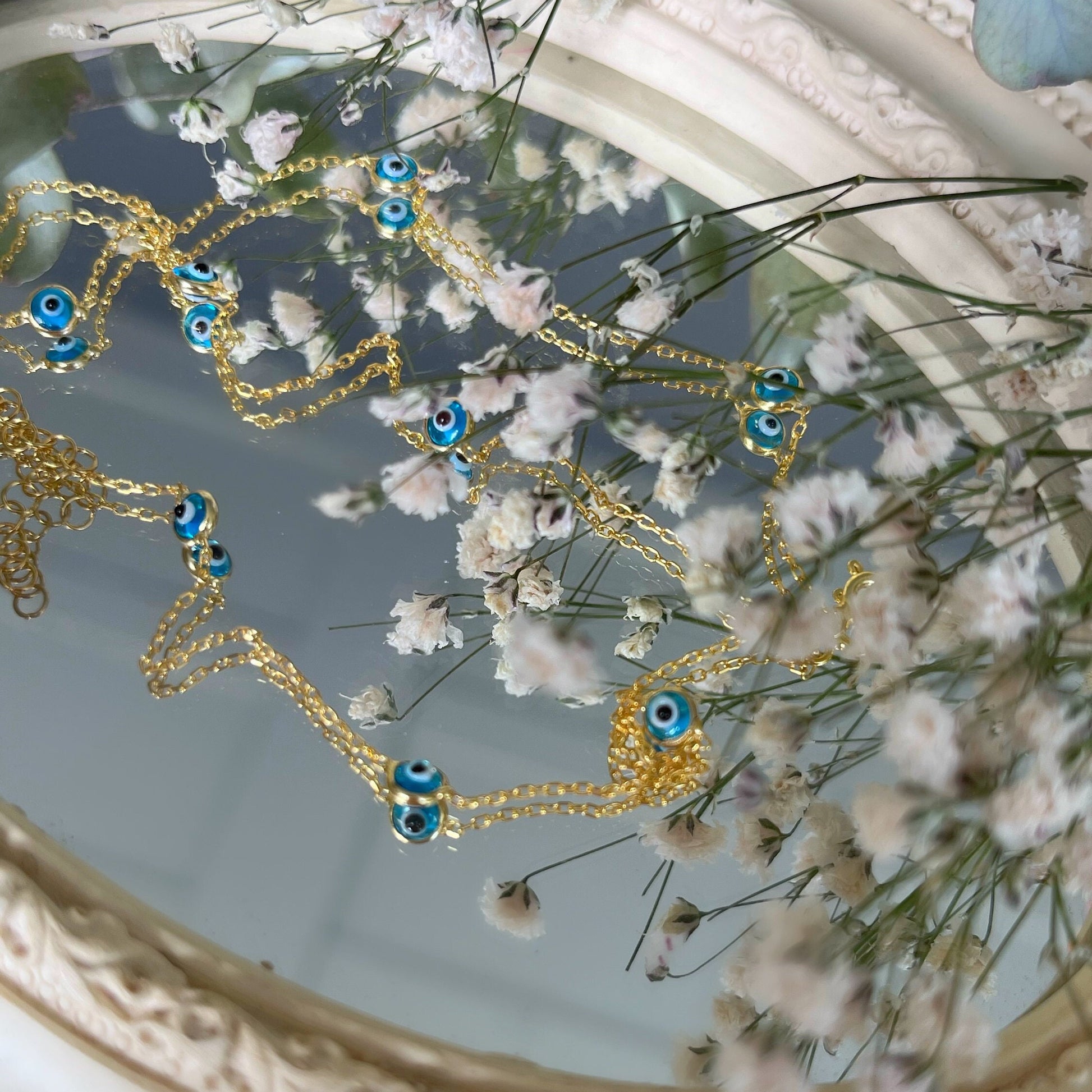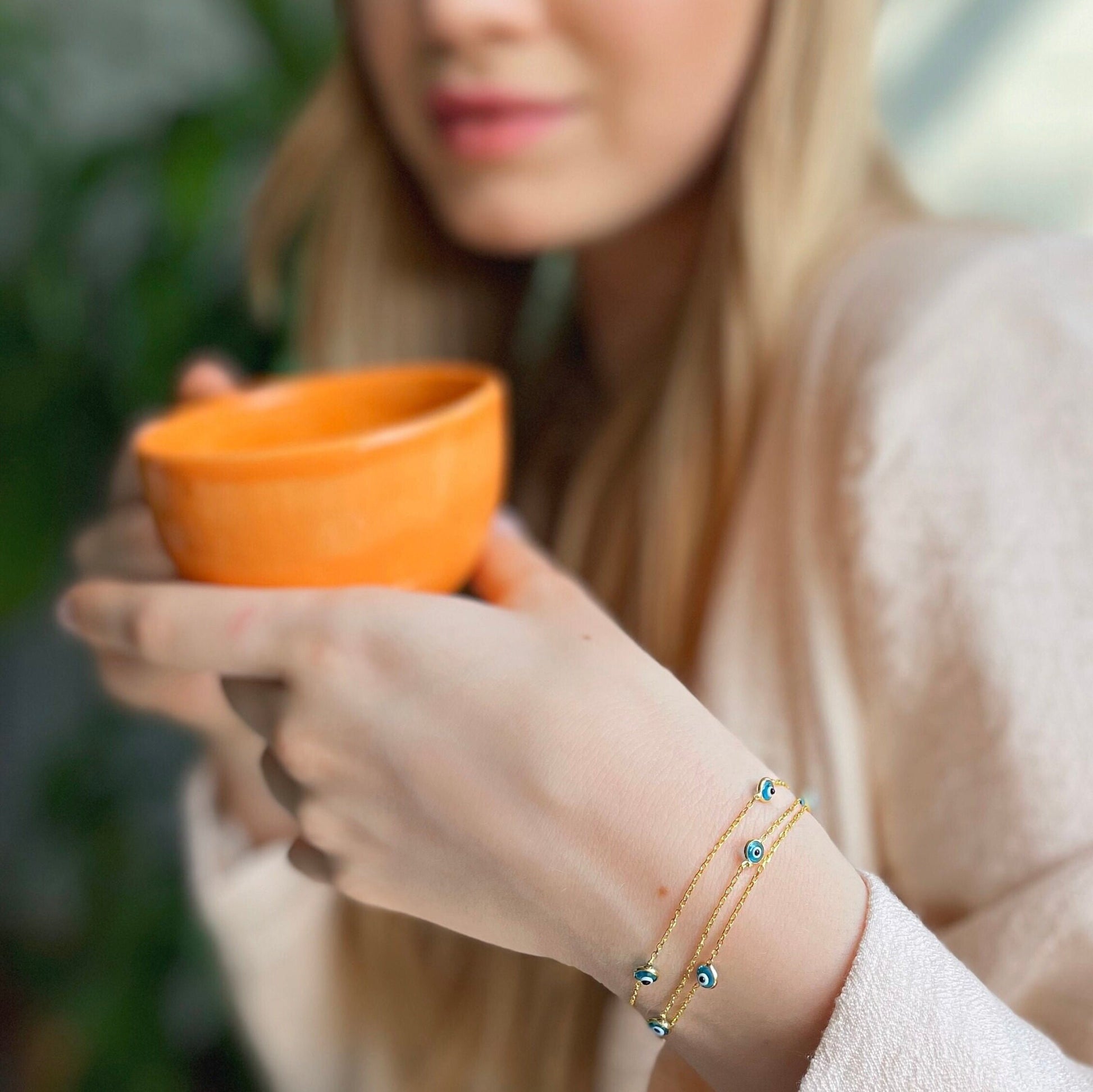 Evil Eye Bracelet With Blue Beads - Spiritual Bracelet - Gold Color Triple Chain Jewelry - Protection & Positive Energy - Summer Jewelry