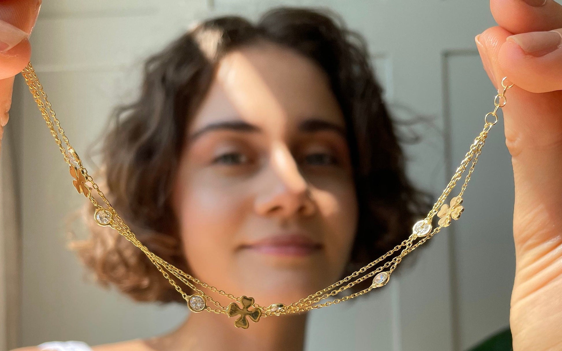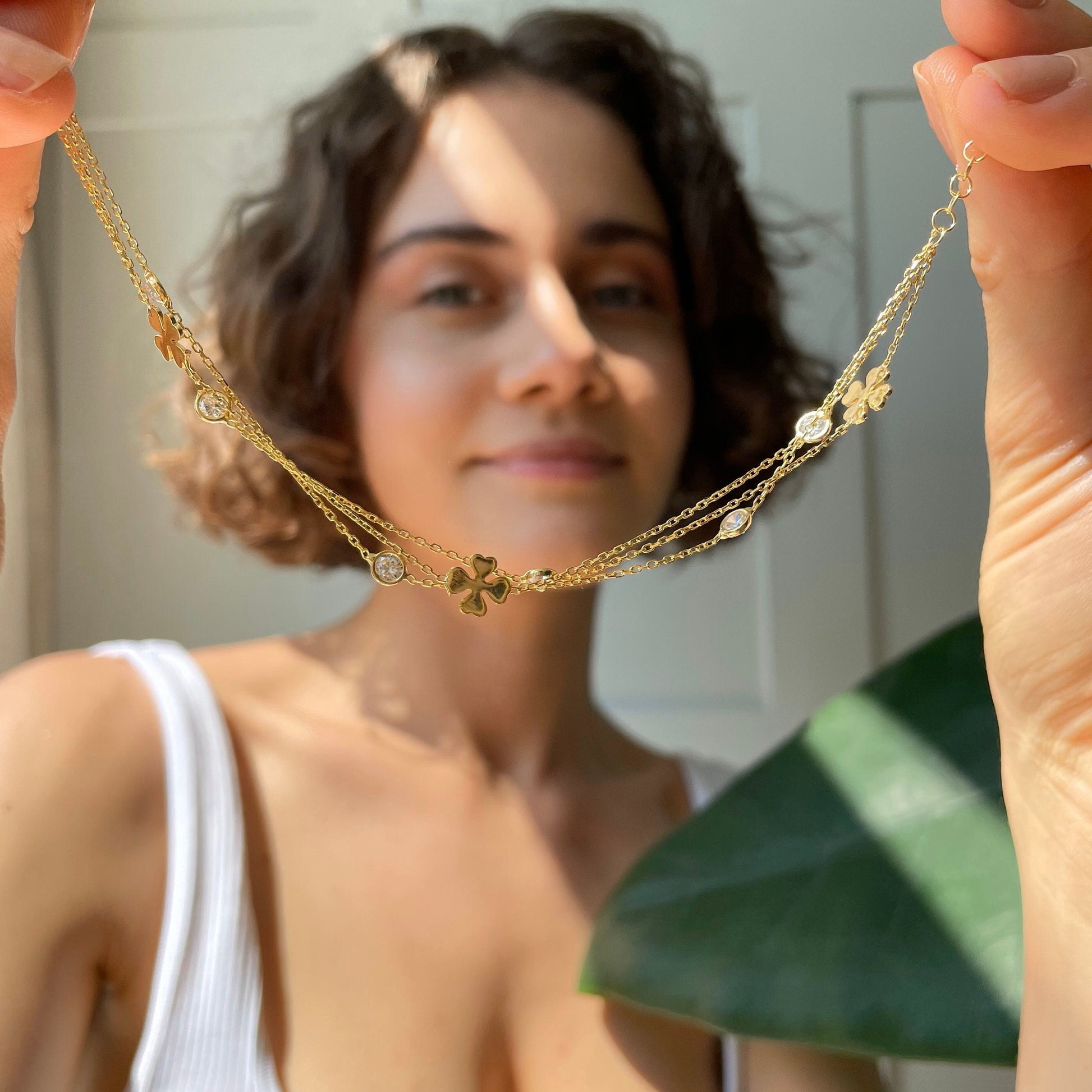 Gold Color 3 Layer Chain Bracelet - Multi-row Shamrock & Cz Bezel Bracelet - 3 Layer Four Leaf Clover Bracelet With Round Zirconia