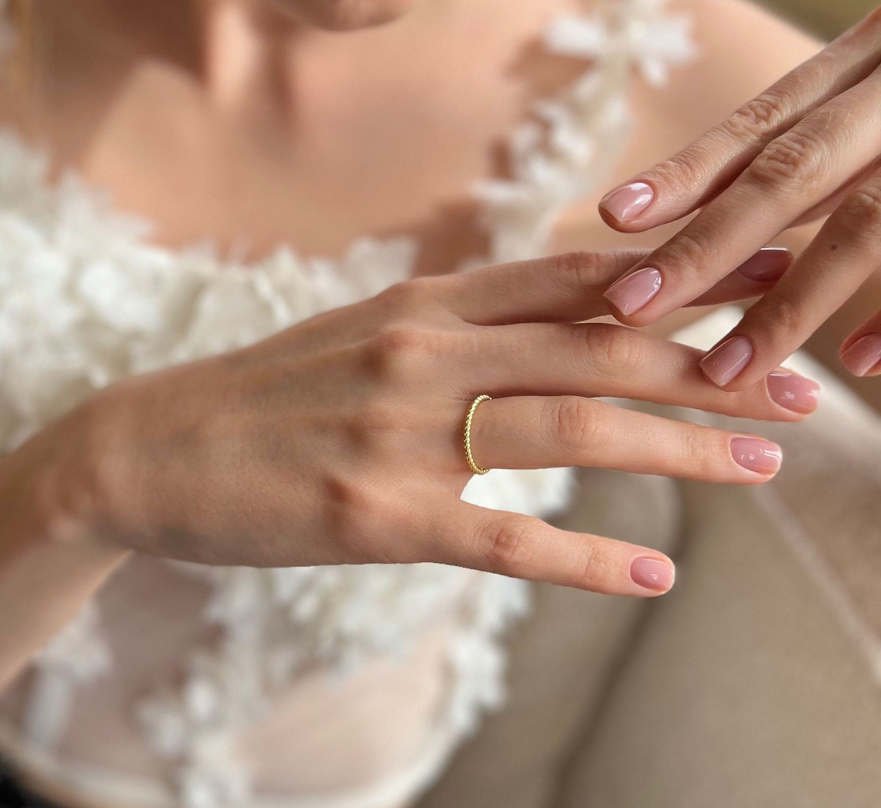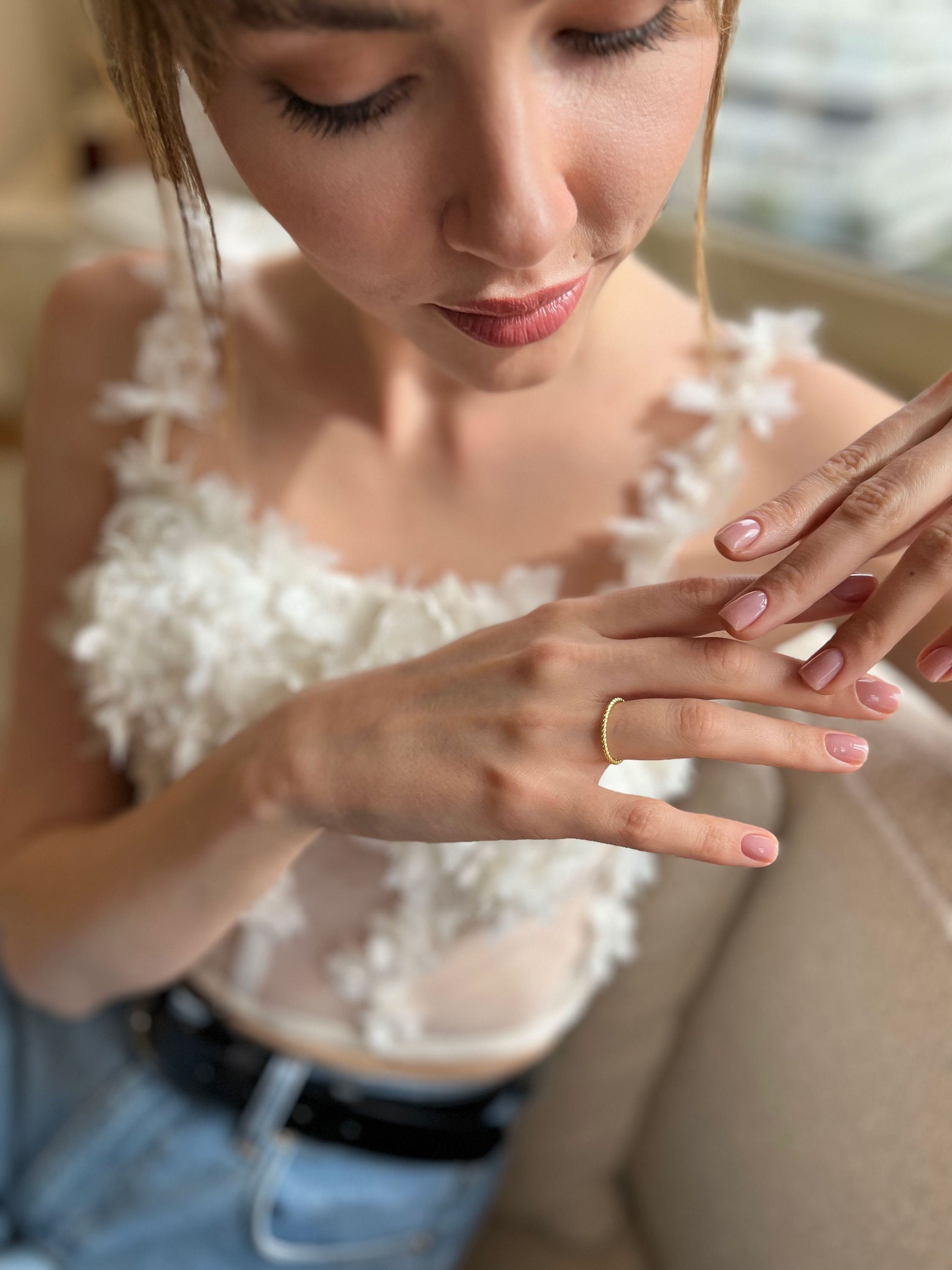 Gold Color Twisted Rope Ring - Anniversary Ring - Thin Gold Band Dainty Ring - Wedding Band - Sterling Silver Summer Jewelry