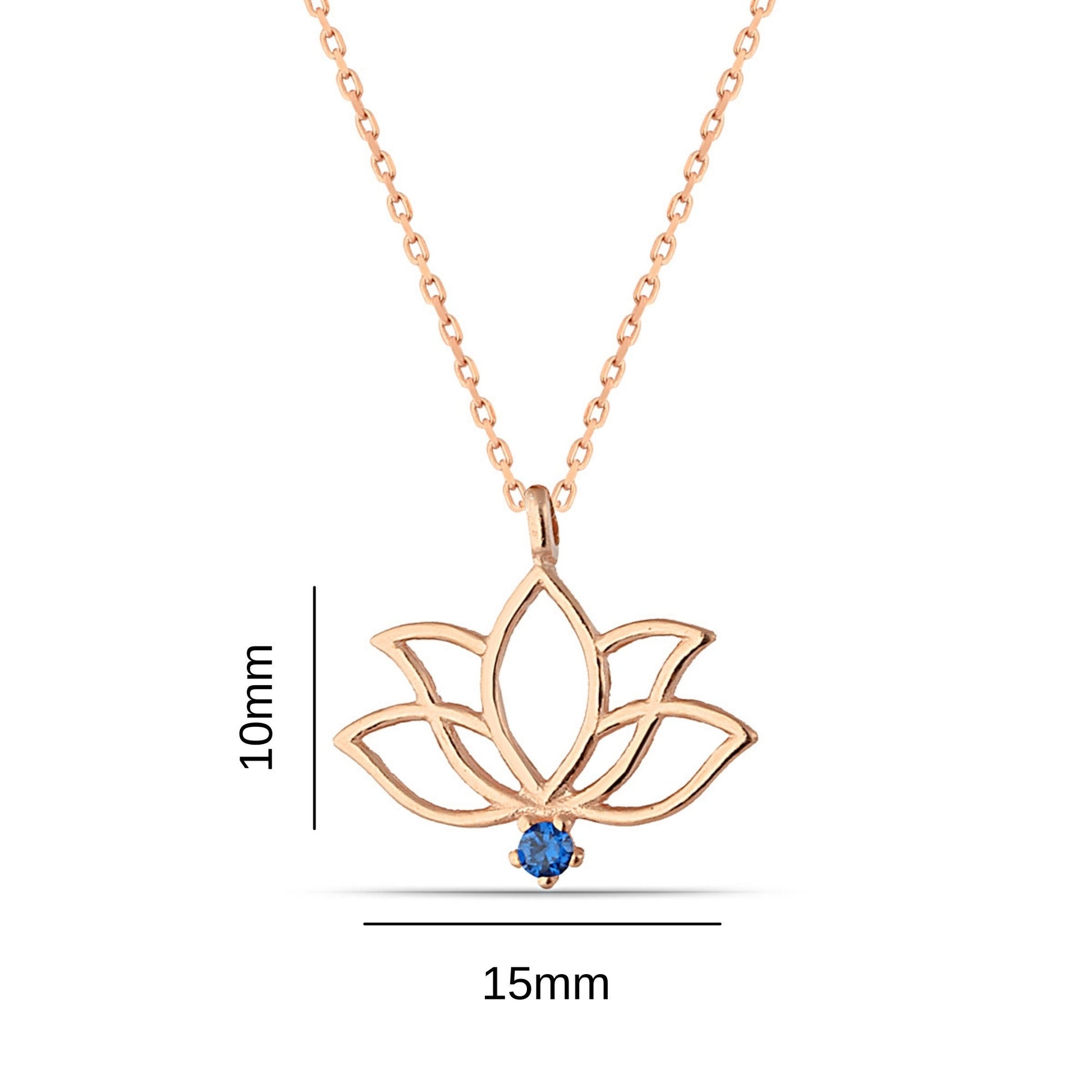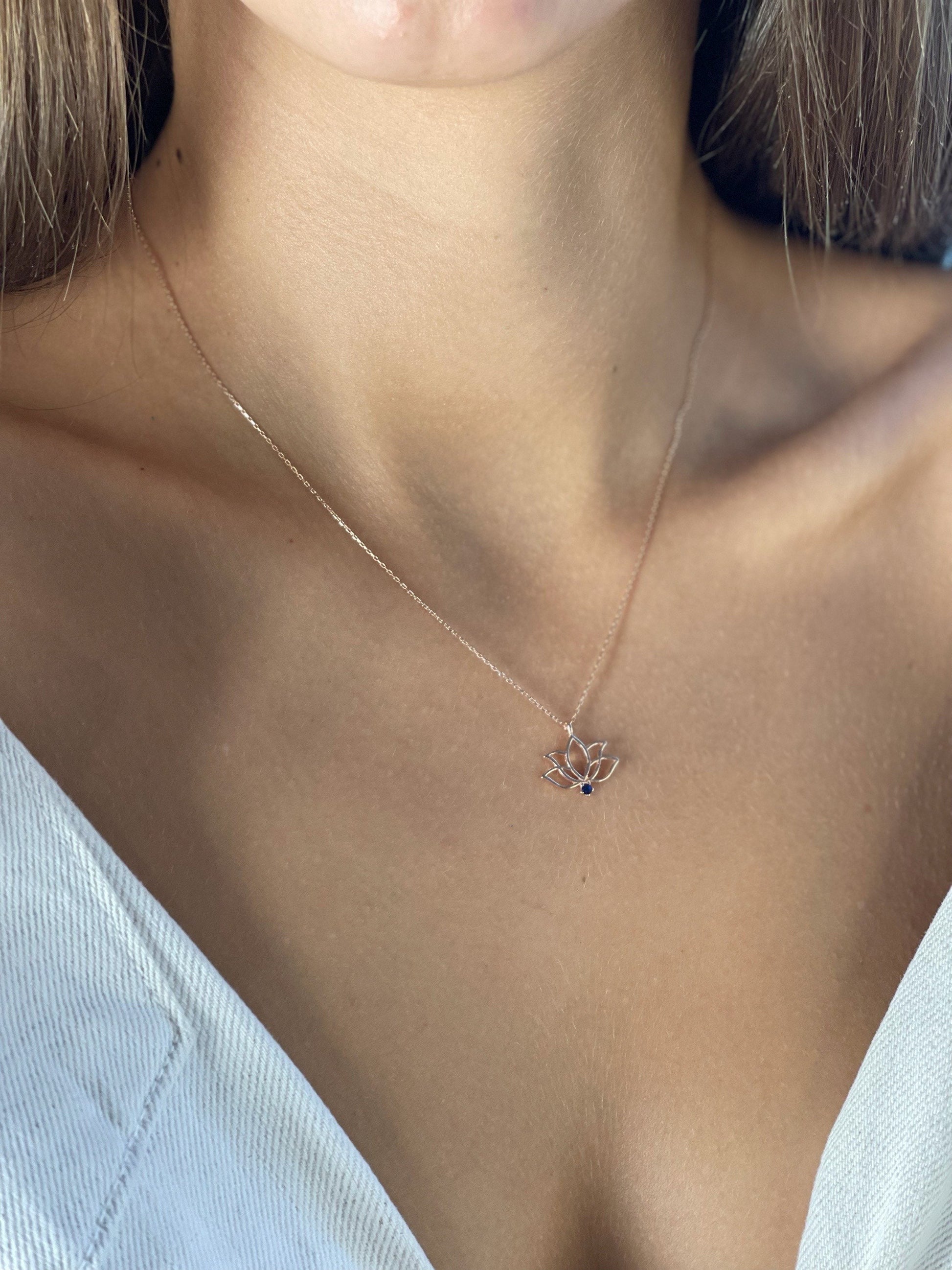 Lotus Flower Necklace, 925 Sterlin Silver Yoga Pendant, Rose Gold Zen Necklace With Tiny (2mm) Navy Gemstone, Necklace For Yogi