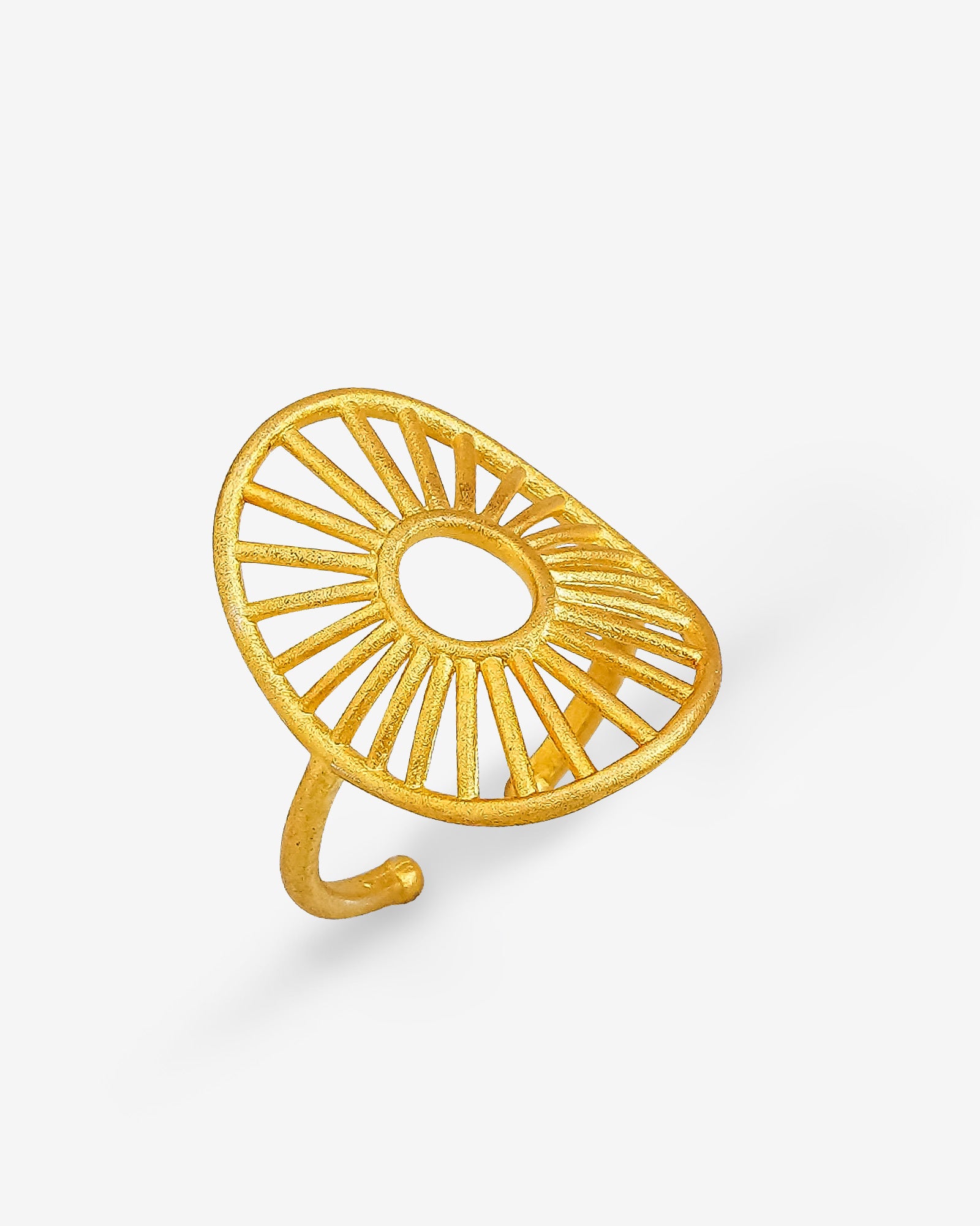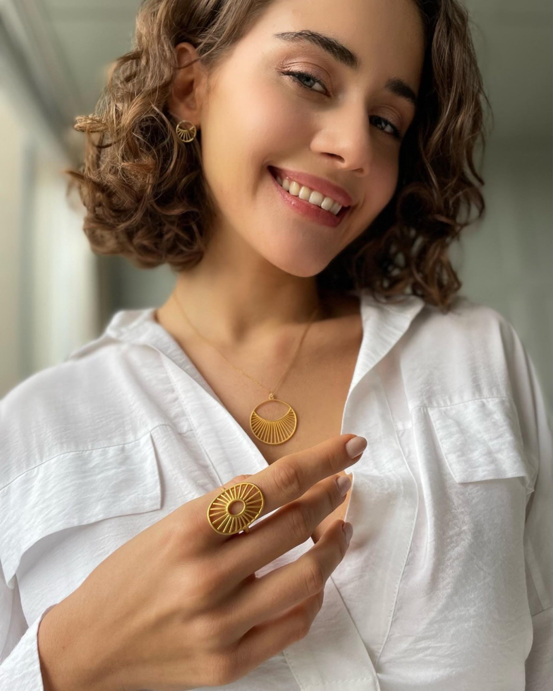 This antique gold plated jewellery set is crafted in 925 sterling silver and inspired by radiant daylight and sunburst motifs. Featuring a statement necklace, matching ring and elegant earrings, it offers a harmonious blend of modern design and timeless warmth. A striking yet wearable set perfect for special occasions or elevated everyday styling.