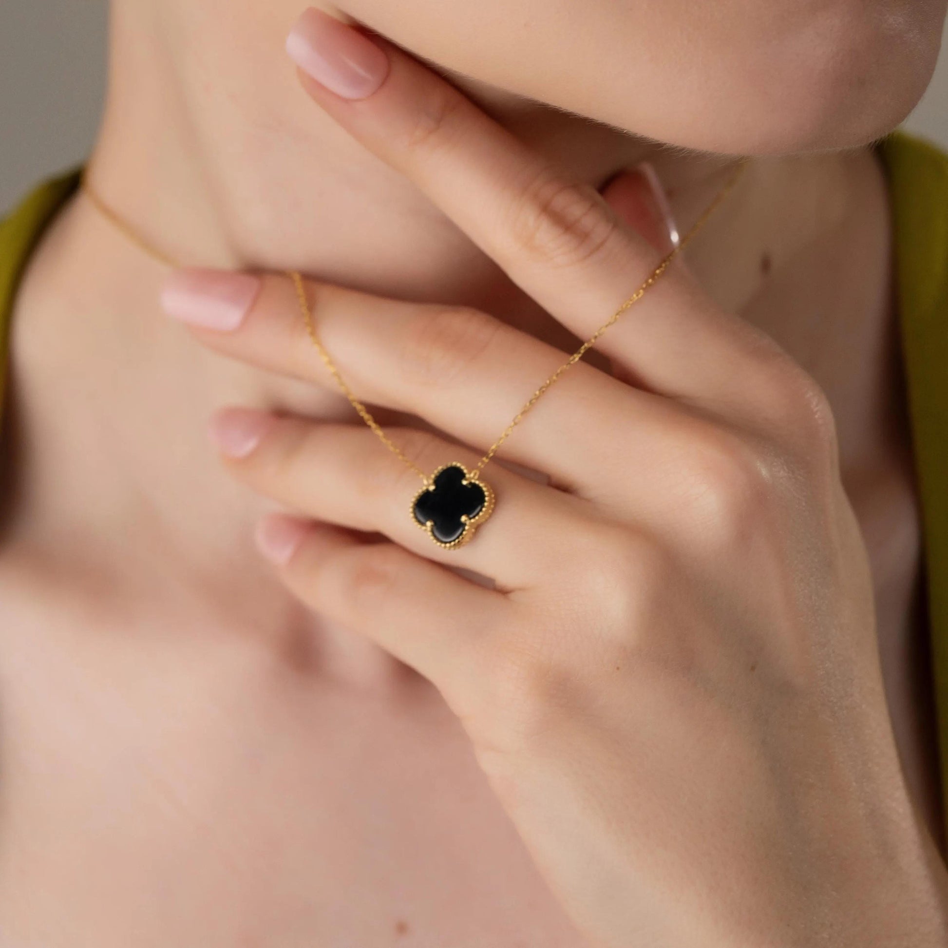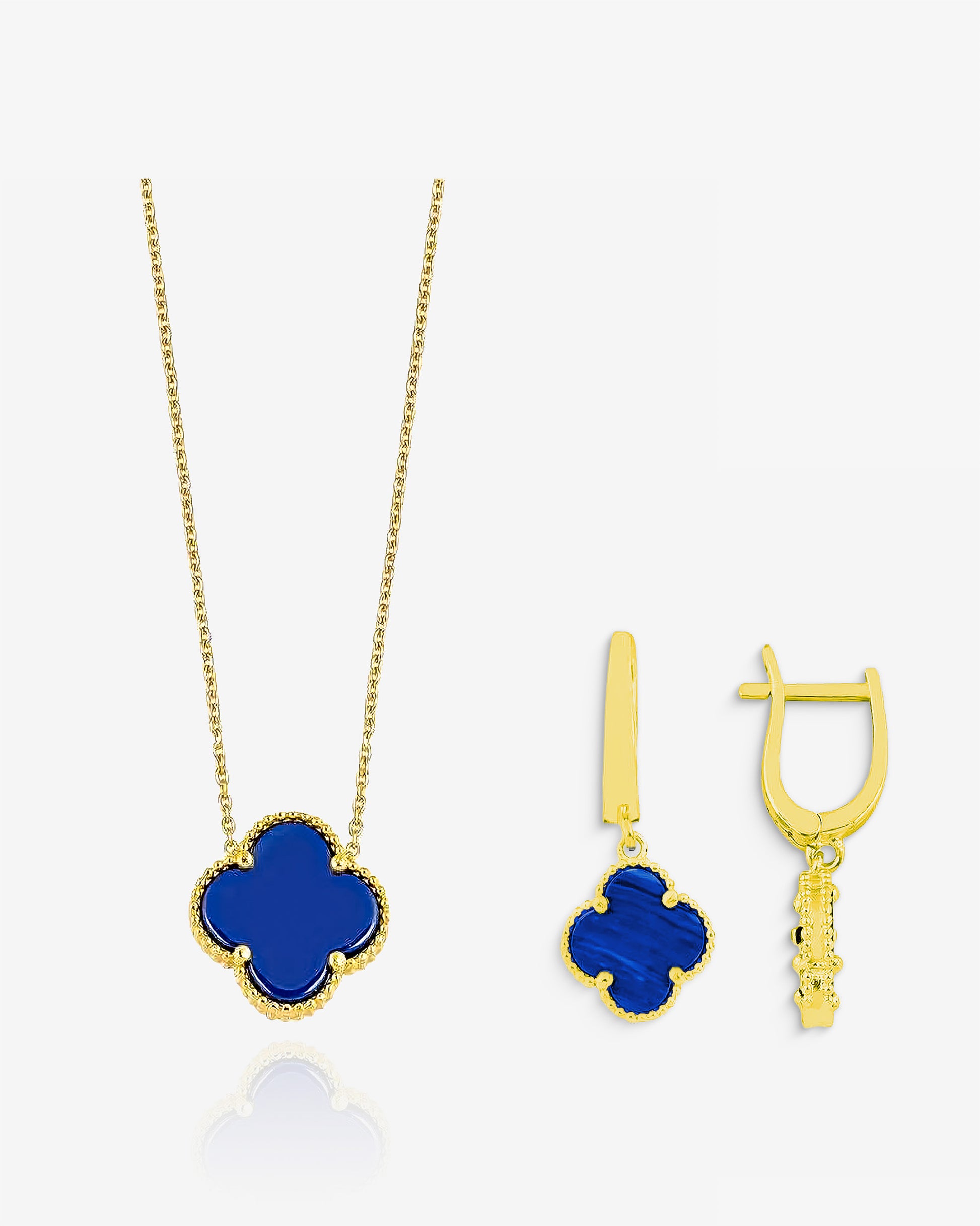 This elegant black four leaf clover jewelry set includes a matching necklace and earrings designed as a timeless lucky charm. This set is available in four stunning gemstone colors —black, navy blue, white, and green— and your choice of a gold or silver chain. A thoughtful and stylish gift choice for everyday wear or special occasions.