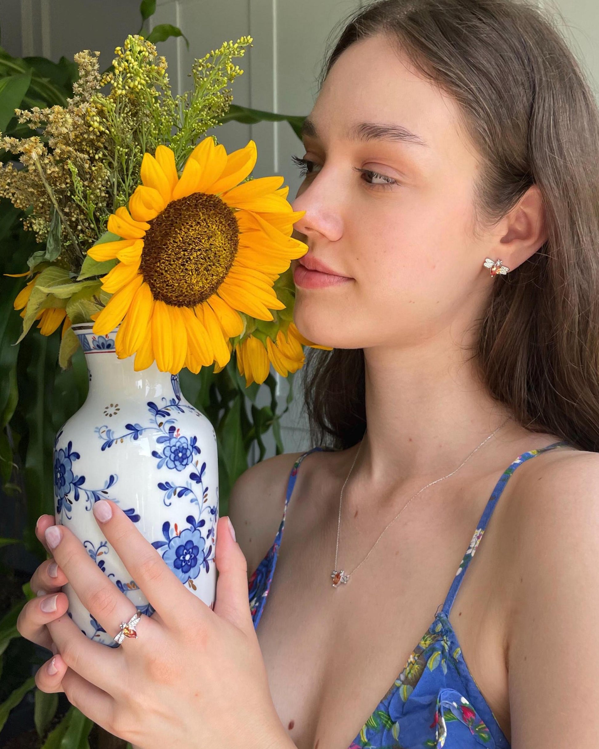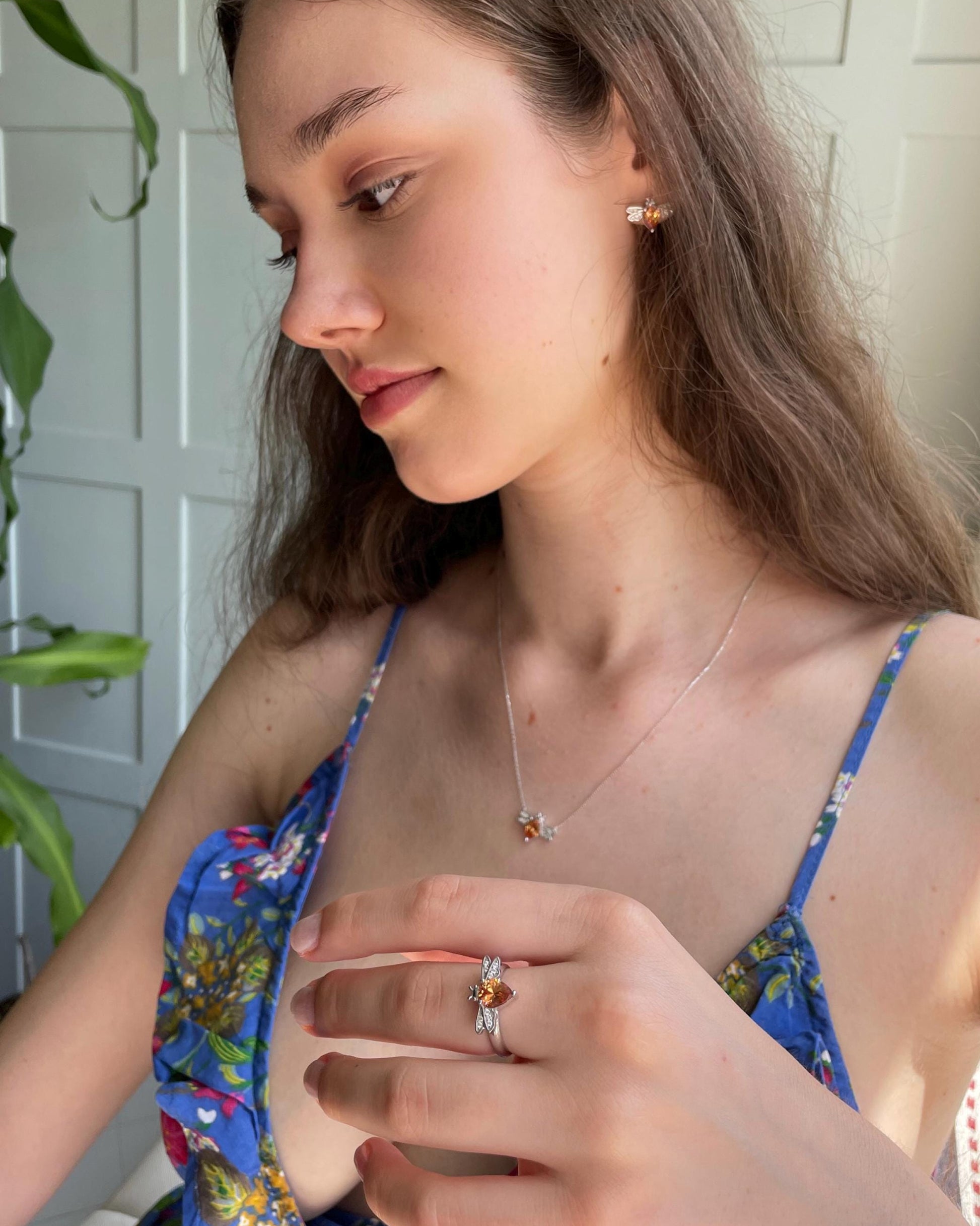 Elevate your look with this Champagne Gemstone Honeybee Jewelry Set, featuring a sparkling necklace, matching earrings, and a delicate ring. Crafted in 925 sterling silver with intricate bee detailing, each piece brings a blend of elegance and charm to any outfit. A perfect gift for nature lovers or anyone who enjoys unique, eye-catching accessories.