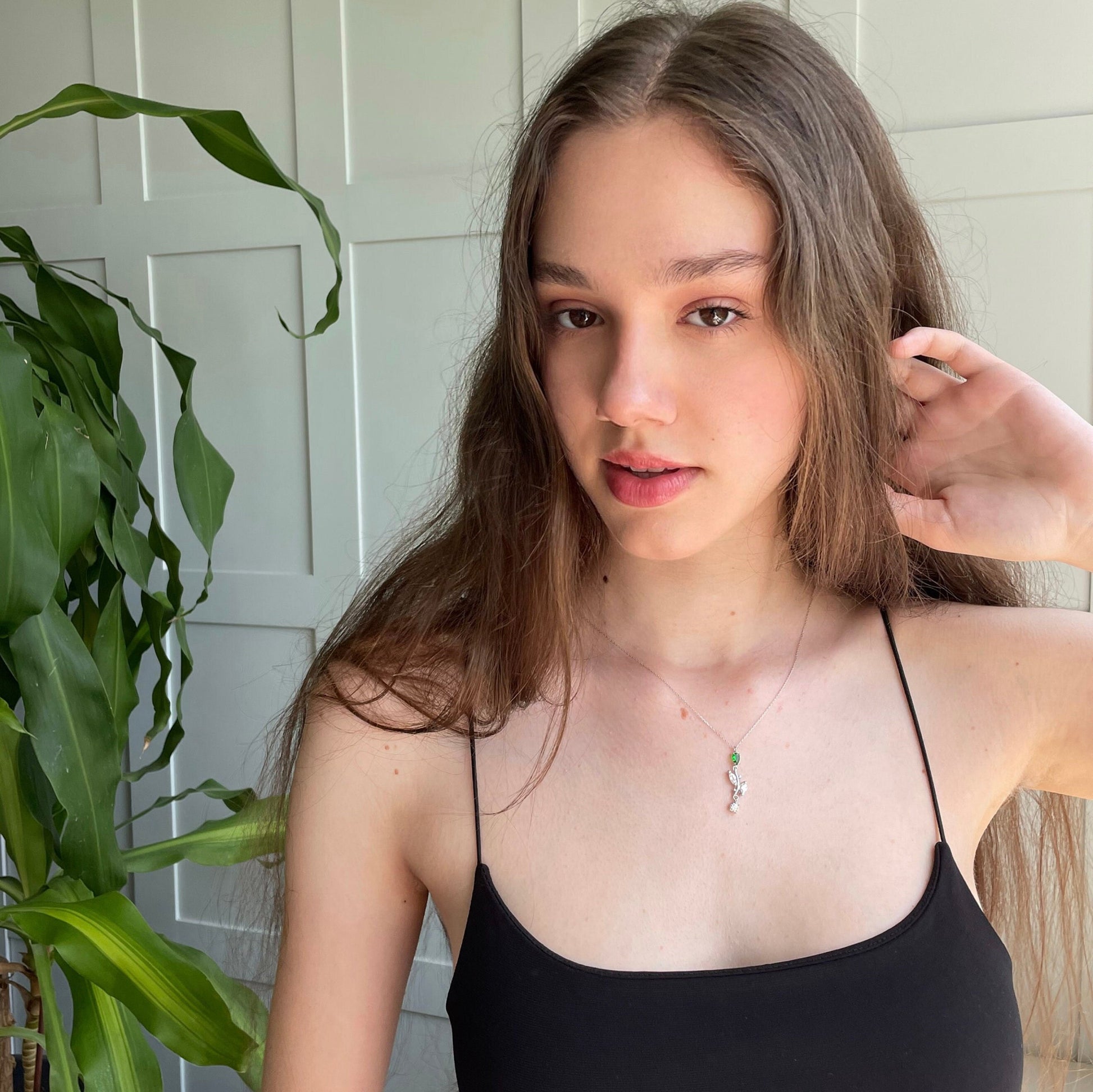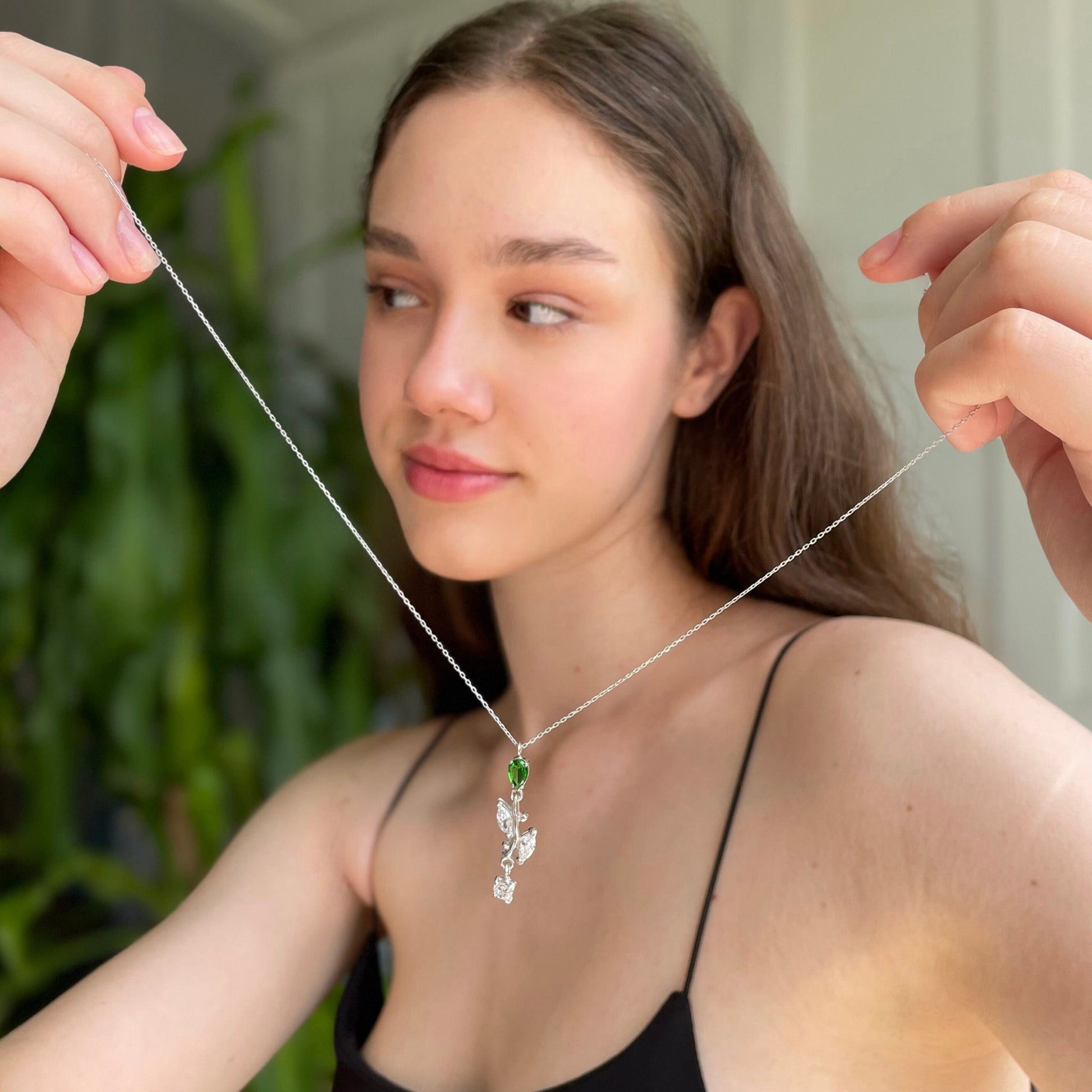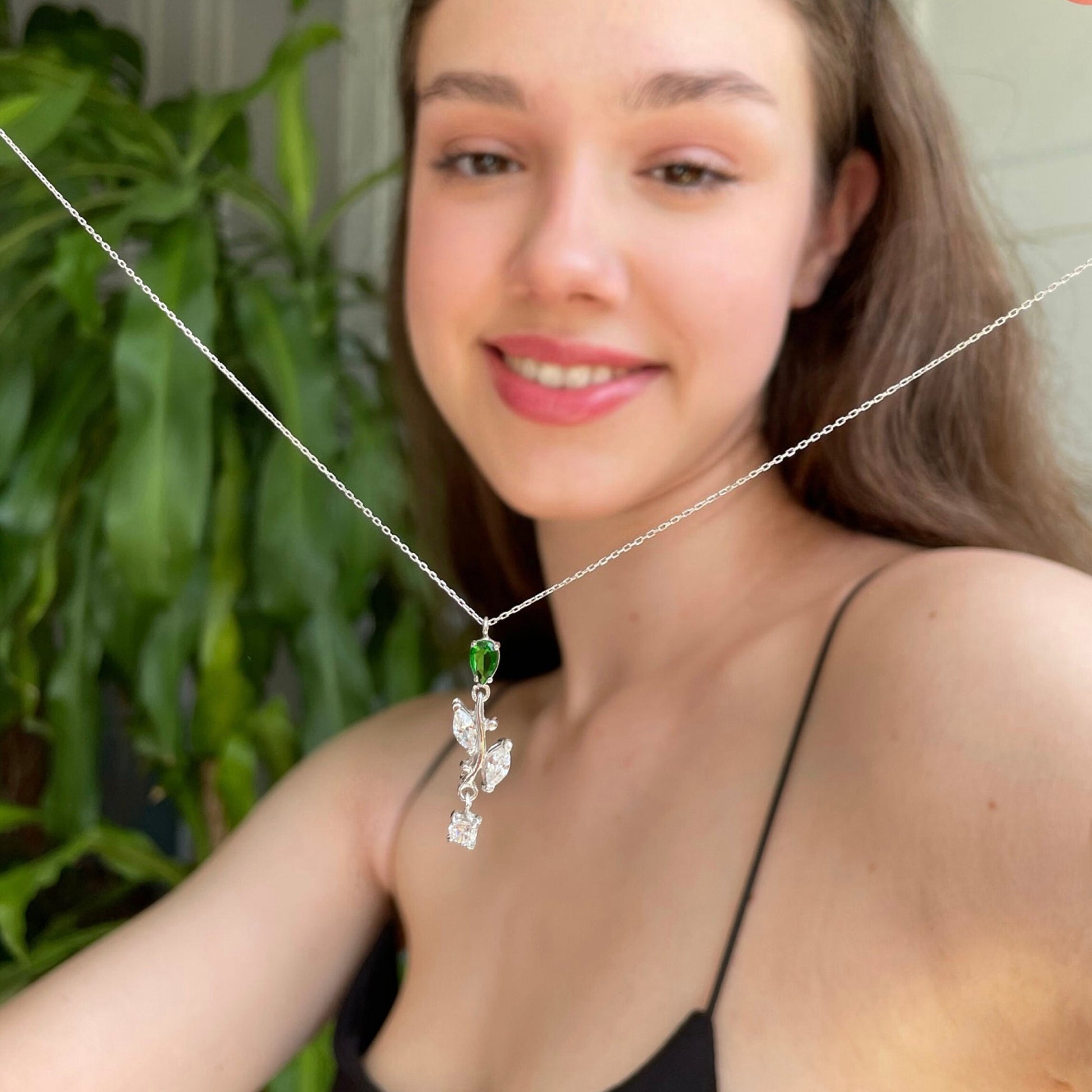 This elegant flower necklace features a delicate emerald-toned centre accented with sparkling cubic zirconia in a graceful dangle design. Handcrafted from sterling silver, it offers a refined yet feminine look perfect for everyday wear. A charming and thoughtful gift for those who love floral-inspired jewellery.