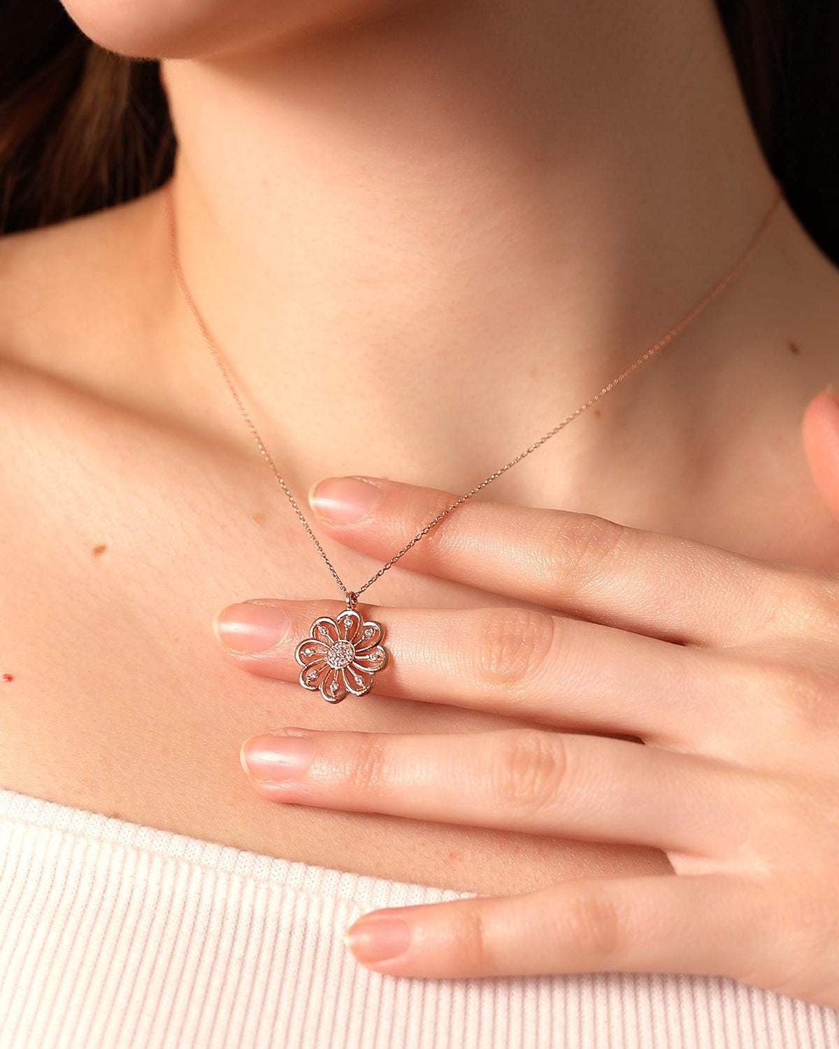 This rose gold floral blossom necklace features a delicate daisy-inspired pendant crafted with elegant detailing. Its minimalist yet eye-catching design makes it perfect for everyday wear or as a thoughtful gift. Handmade in sterling silver, it brings a soft, feminine touch to any jewelry collection.