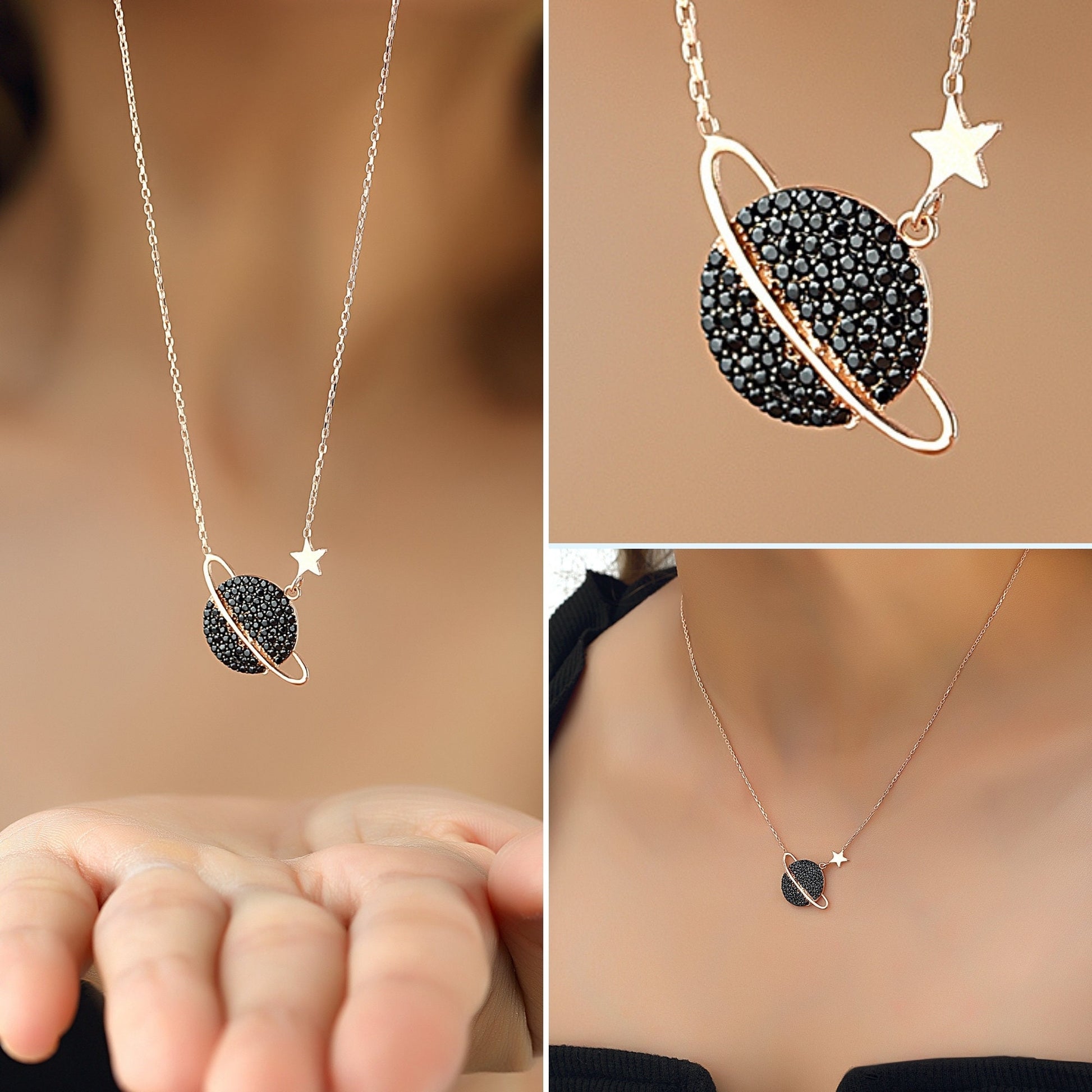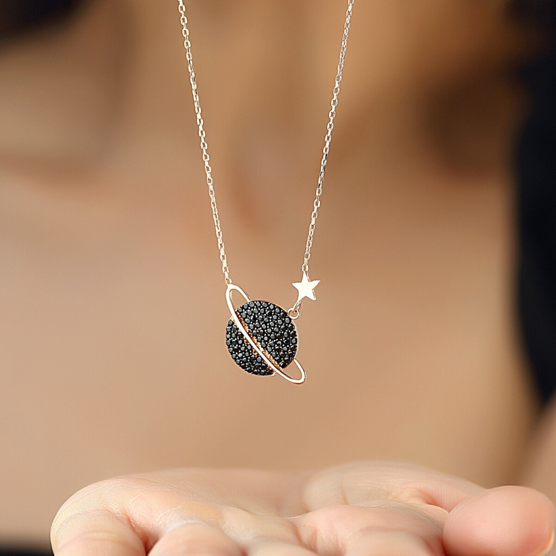 Inspired by the magic of the universe, this planet and star necklace symbolises love, dreams and infinite connection. The refined pavé detailing brings soft elegance to its minimalist silver design. A beautiful personalised-style gift for birthdays or special moments.