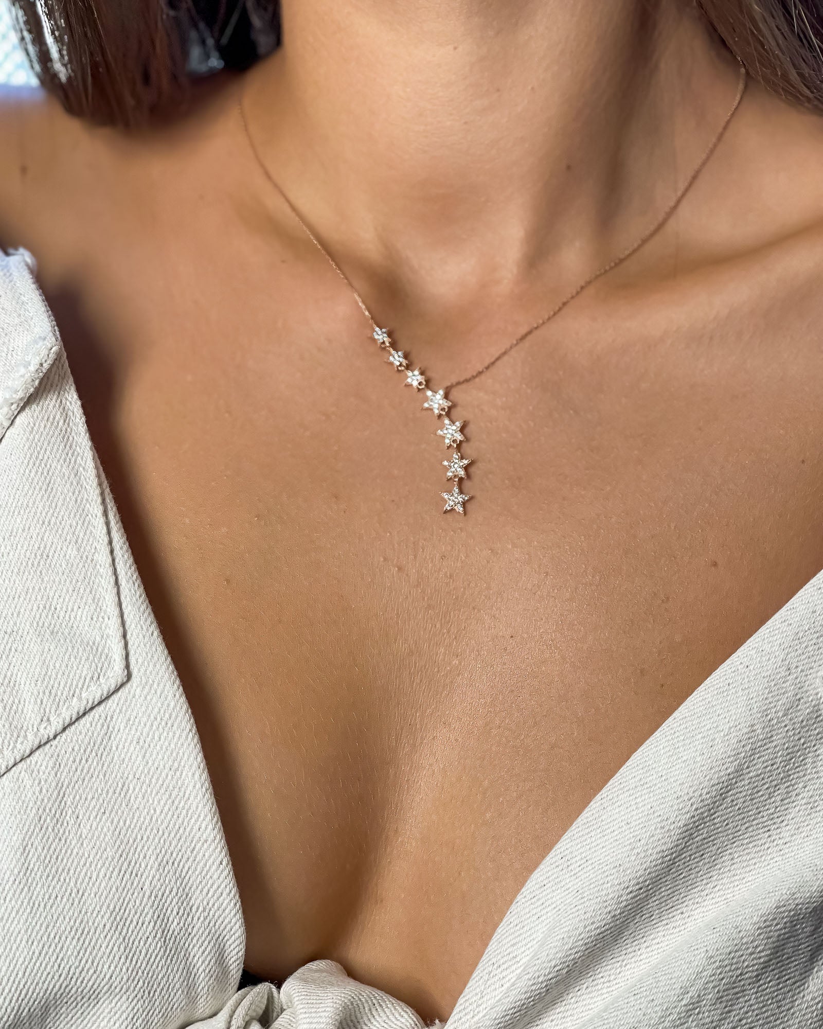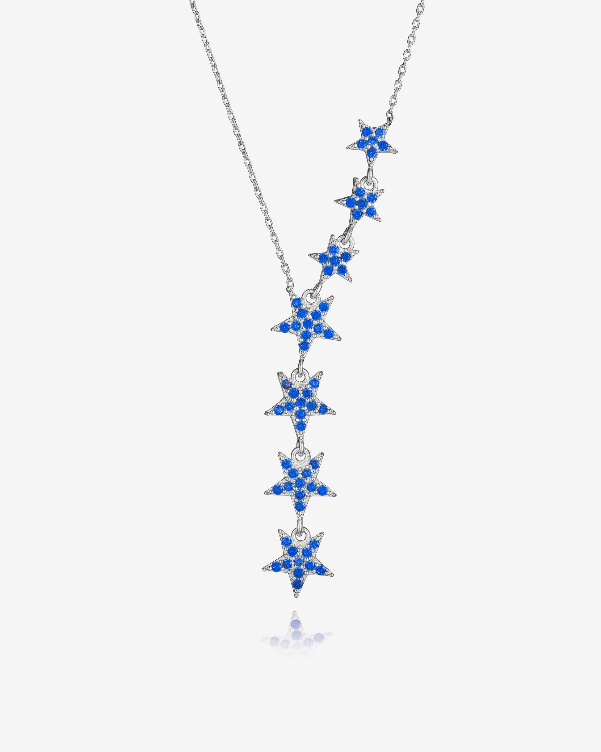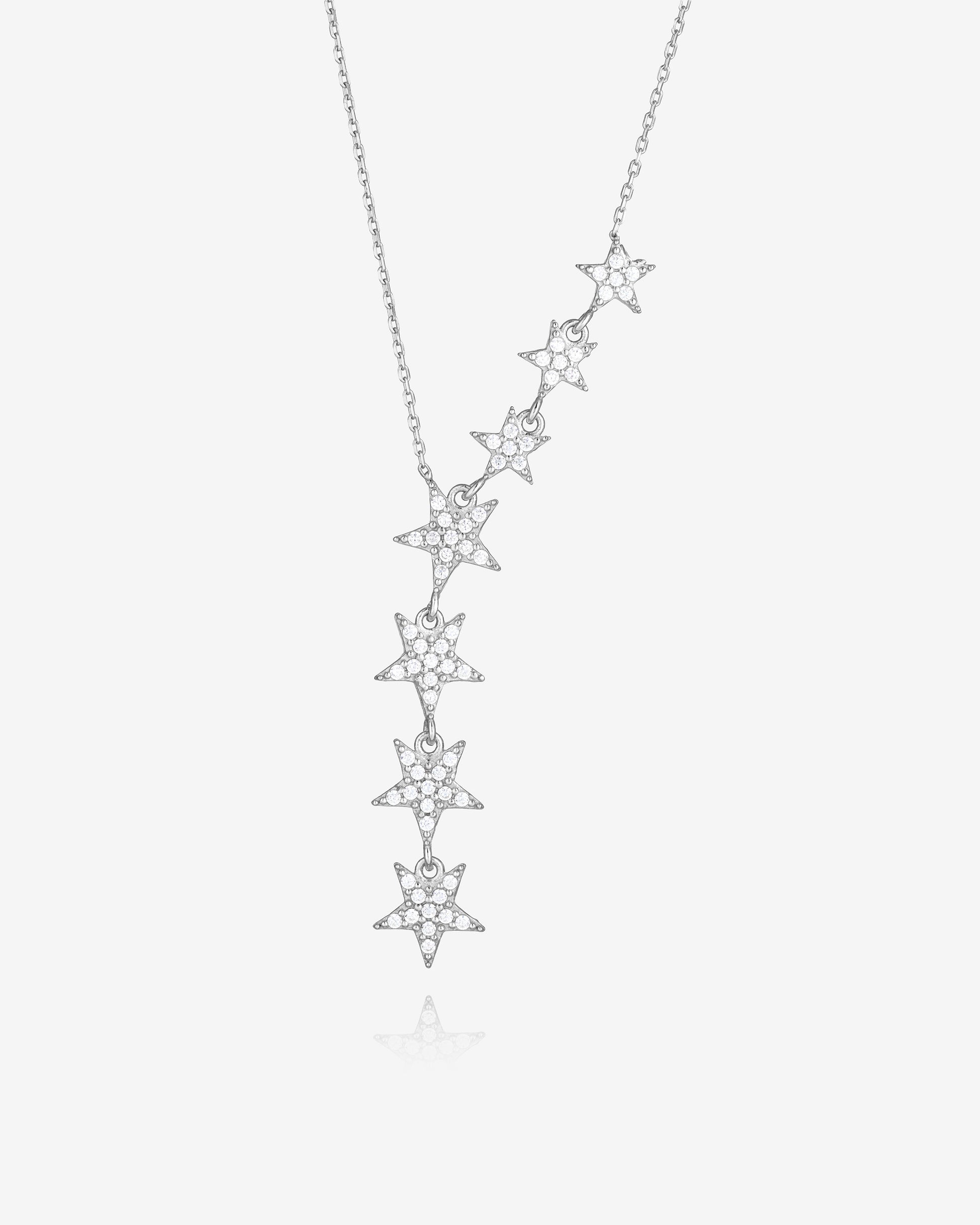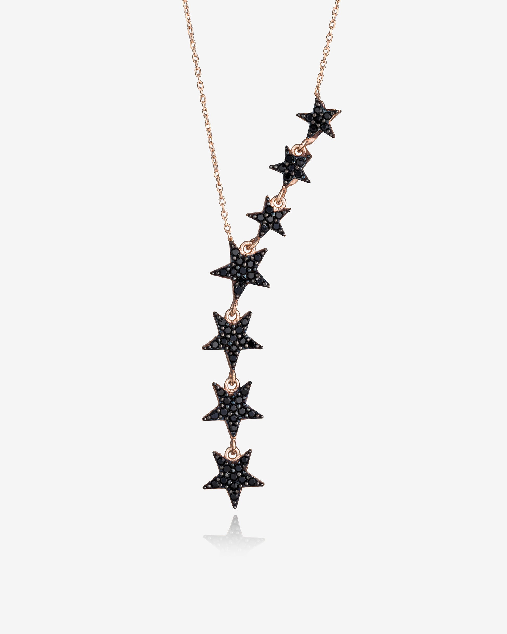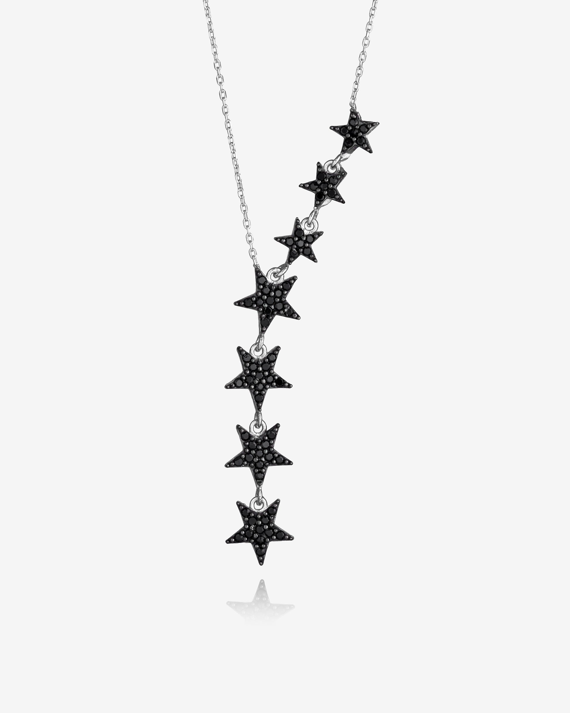 This star lariat necklace features an elegant asymmetric Y-shape design with a delicate drop star pendant for a modern, eye-catching look. Its refined silhouette makes it perfect for everyday wear or special occasions. Available in silver, gold, and rose gold chain options with black or white gemstone choices.