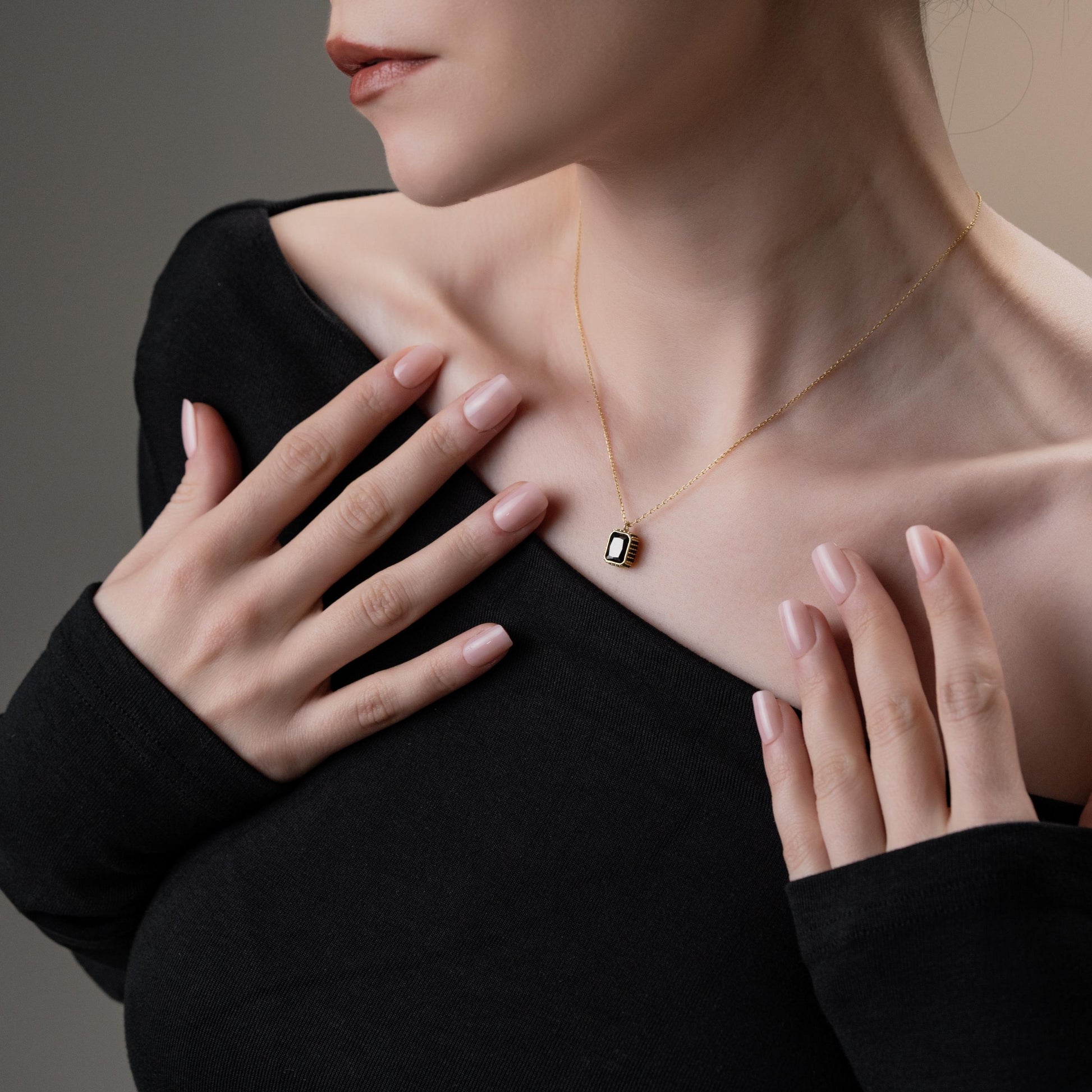 A sleek baguette-cut black stone set in a refined gold frame for a timeless, minimalist look. This elegant necklace adds effortless sophistication to both everyday outfits and evening wear. A perfect handmade-style gift for women who love understated luxury.