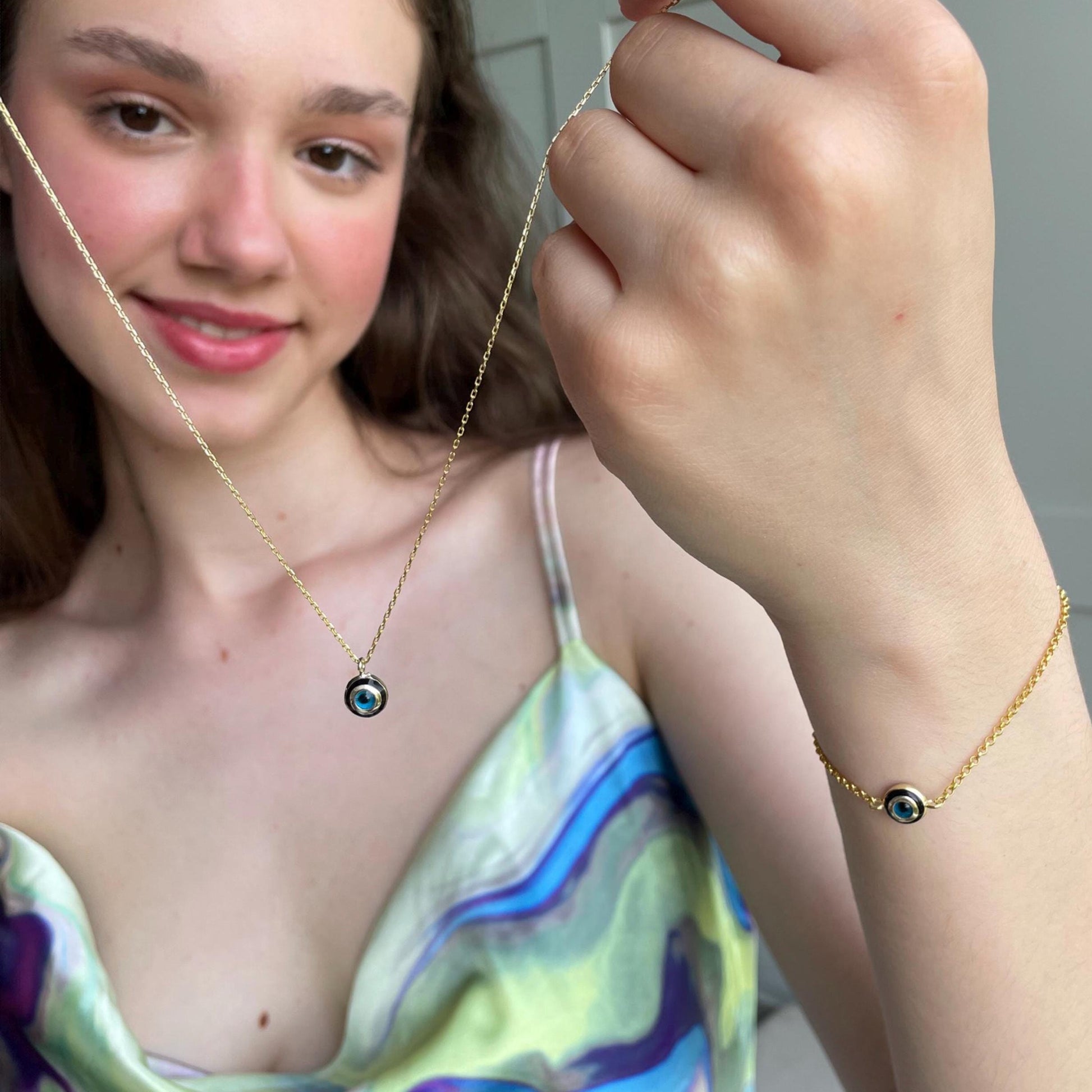 This minimalist necklace features a round evil eye charm with black and white enamel detailing for a clean and modern look. Available with gold or silver chain options, it is perfect for everyday wear and a meaningful symbolic gift.
