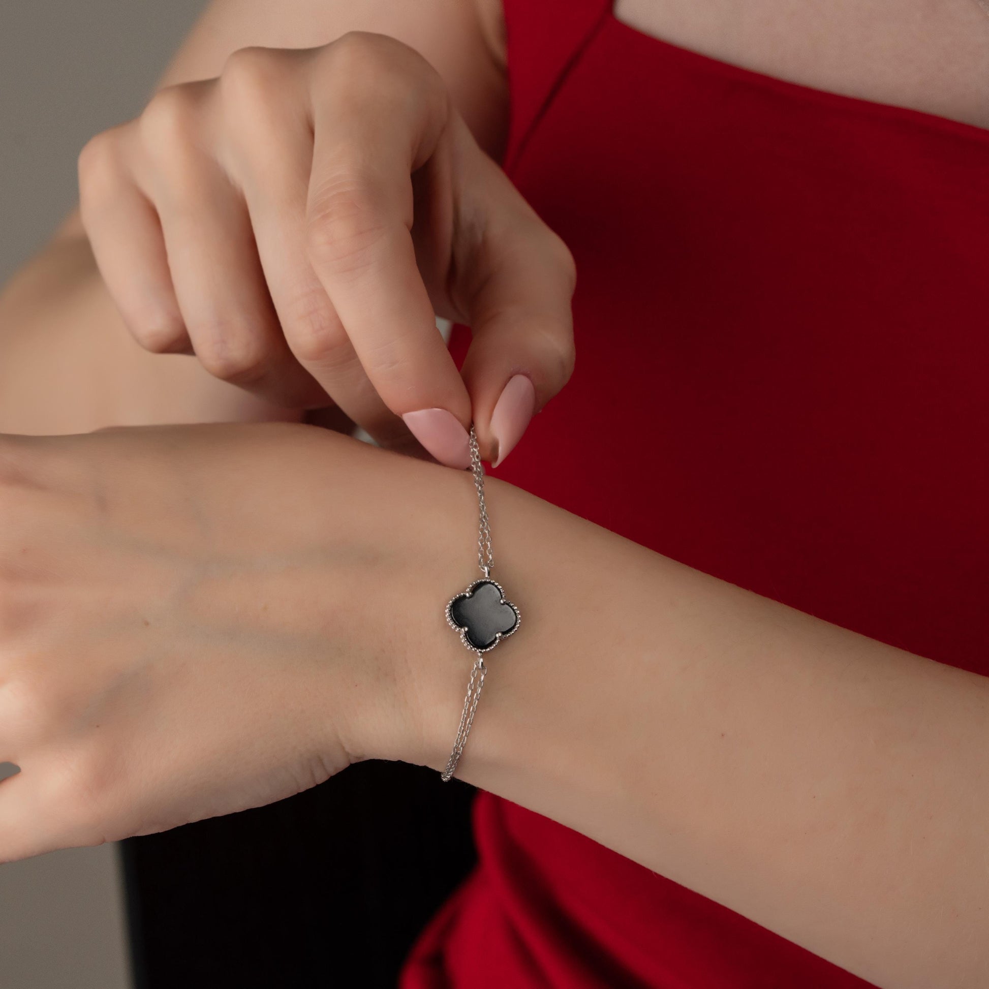 Elegant and versatile, this matching necklace and bracelet set features a four-leaf clover design with your choice of black, navy, white, or green gemstone. Available with gold or silver chain options, it's the perfect touch for both everyday wear and special occasions.