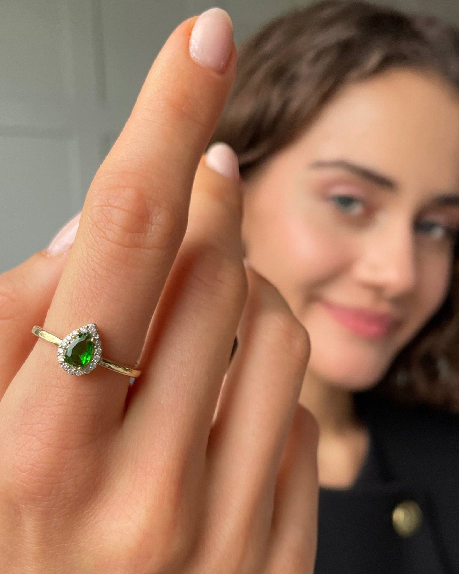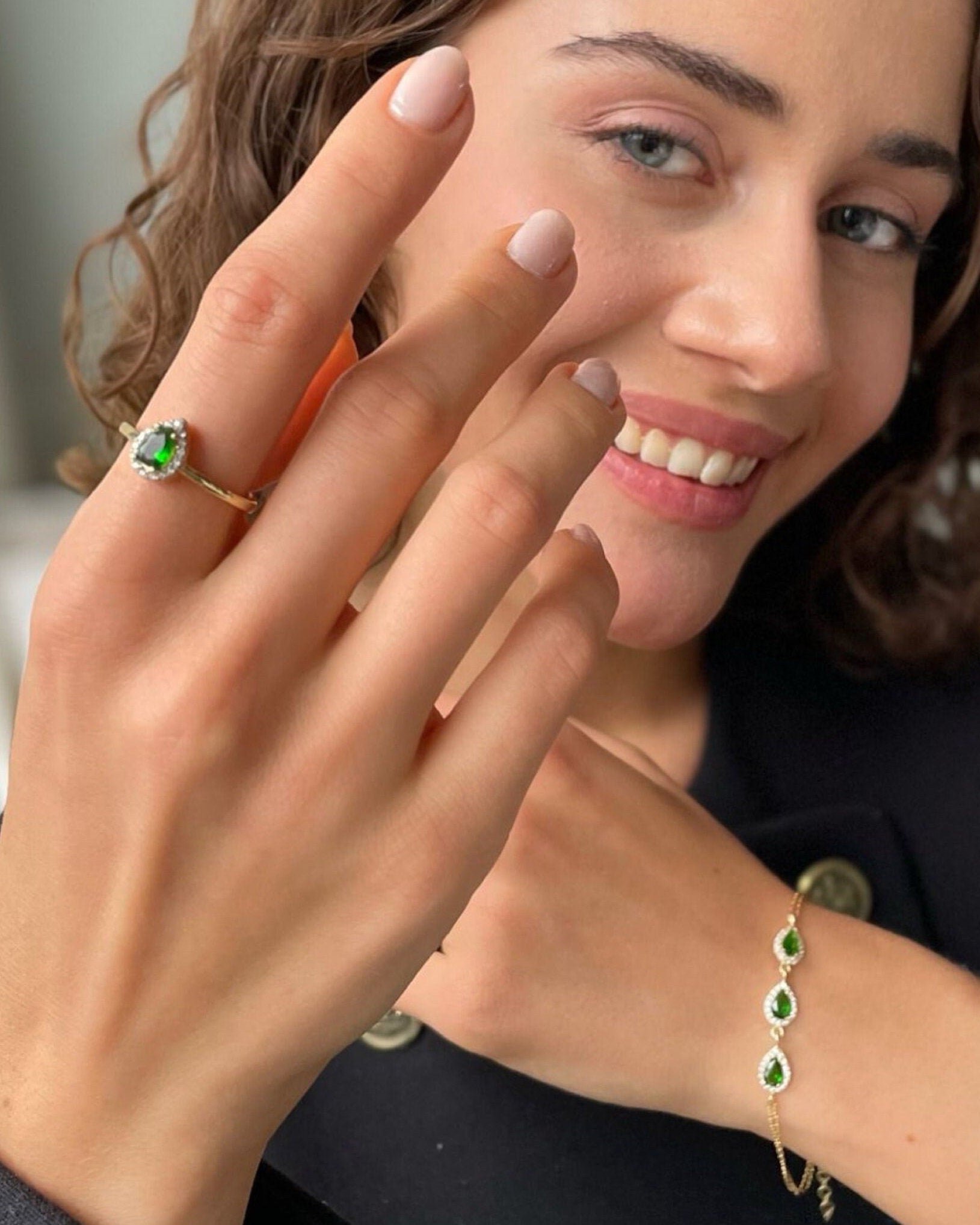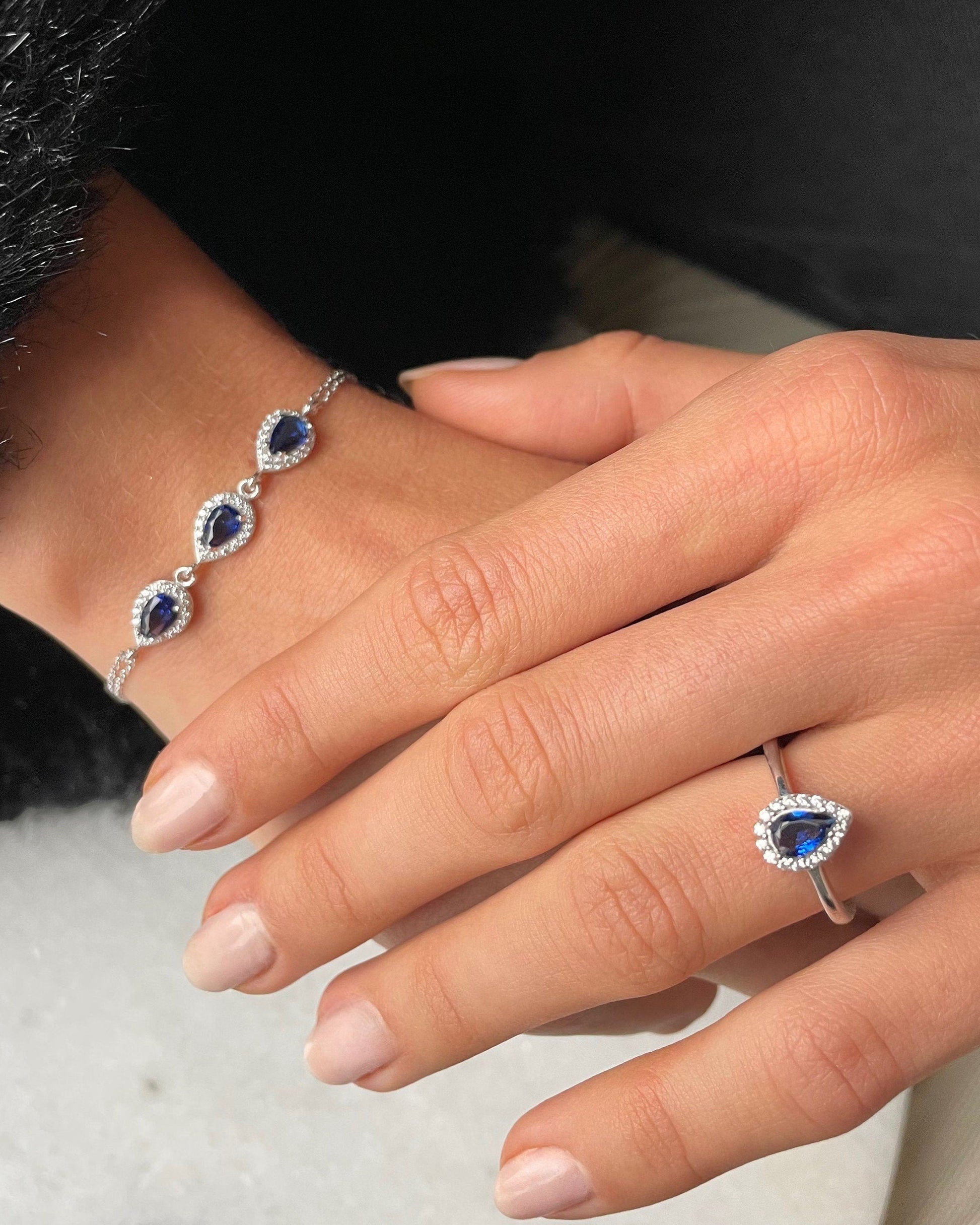 This sparkling jewellery set features a teardrop bracelet and matching ring adorned with shimmering cubic zirconia stones for an elegant finish. Available in sapphire blue, emerald green, and crystal clear options, it is perfect for bridal looks, special occasions, or a meaningful gift.