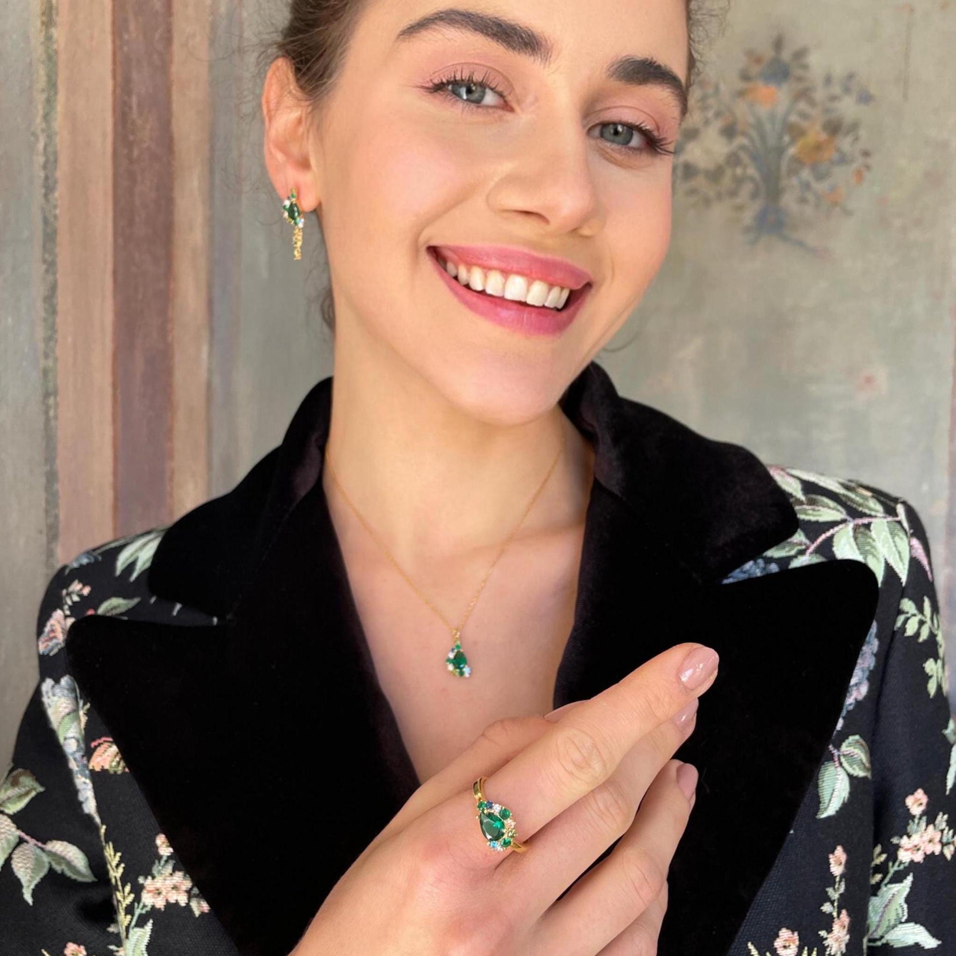 This vintage-inspired necklace features a rich emerald green crystal drop surrounded by sparkling rhinestones for an elegant statement look. Crafted in 925 sterling silver with a timeless design, it adds a touch of classic glamour to evening wear, special occasions or formal outfits. A standout piece for women who love vintage-style jewellery with refined sparkle.